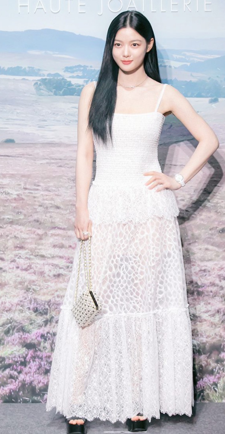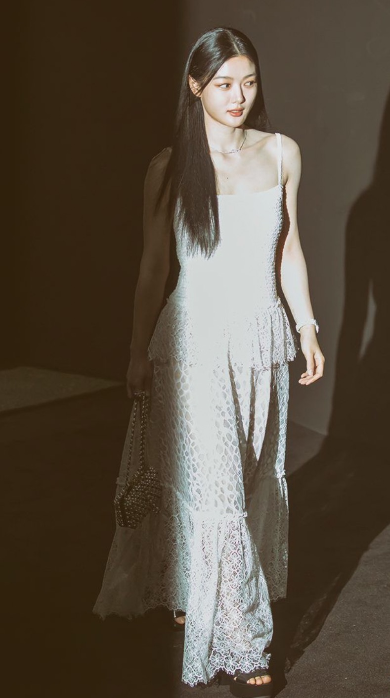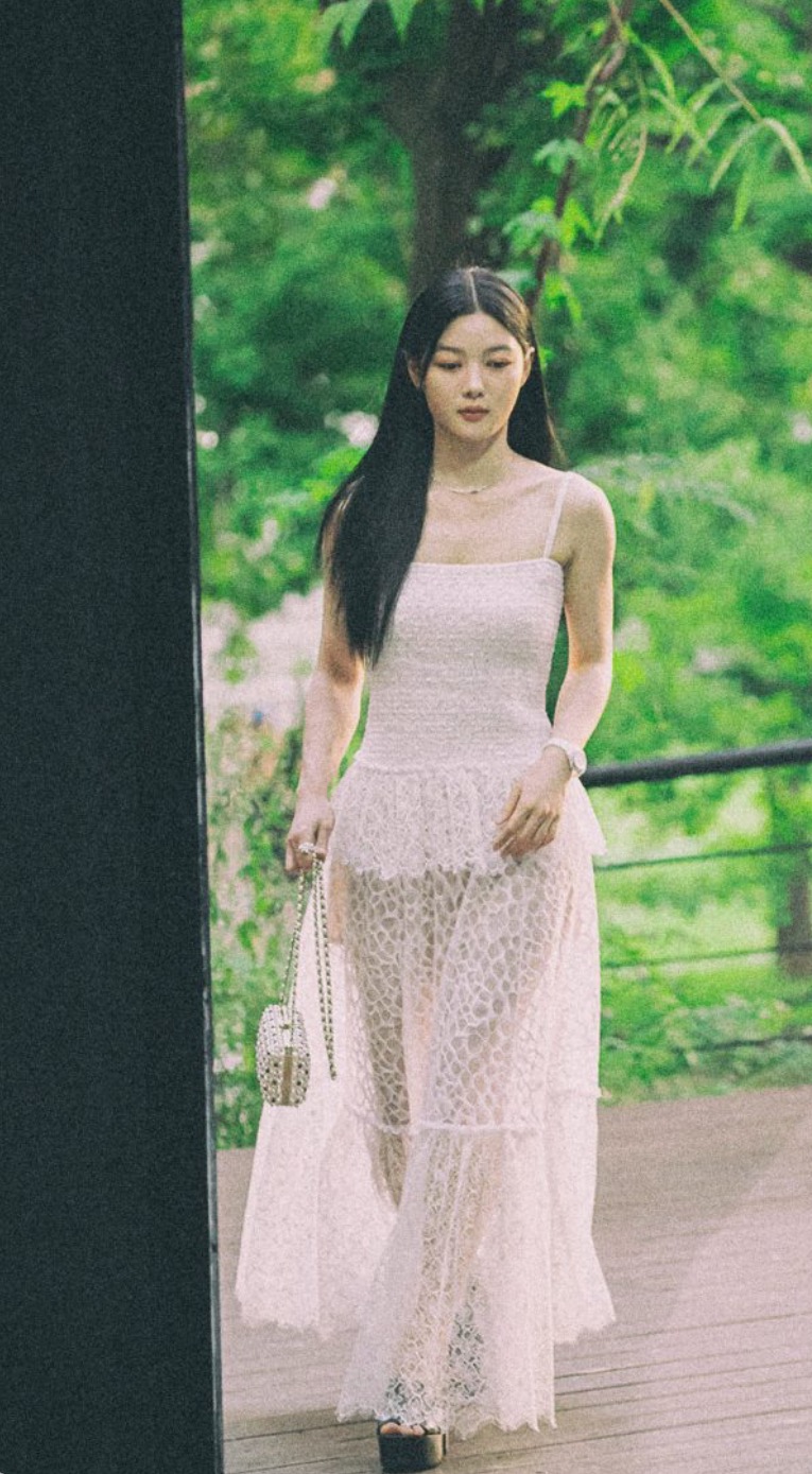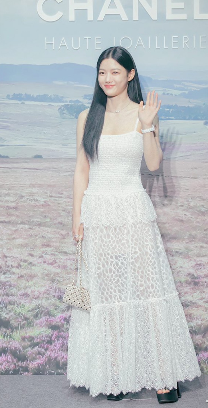 샤넬의 2023 룩북 45번 레이스 맥시 원피스를 선택한 김유정. 흡사 웨딩드레스가 생각나는 순백의 레이스 원피스는 1700만원대이다. 3단 레이어드 드레스로 각 레이어마다 소재와 모양이 다른 레이스로 단조롭지 않고 정교한 디테일을 준 샤넬 드레스이다.