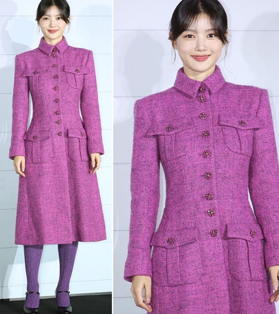 모델 착장과 거의 일치하는 김유정 샤넬 트위드 코트 스타일링. 퍼플 색상의 두꺼운 타이즈에 역시나 두꺼운 소재의 퍼플 트위드 코트로 샤넬 특유의 클래식하고 고풍스러운 무드를 잘 표현한 김유정. 김유정의 상큼한 얼굴과 옷이 주는 상반되는 느낌이 오히려 좋다.